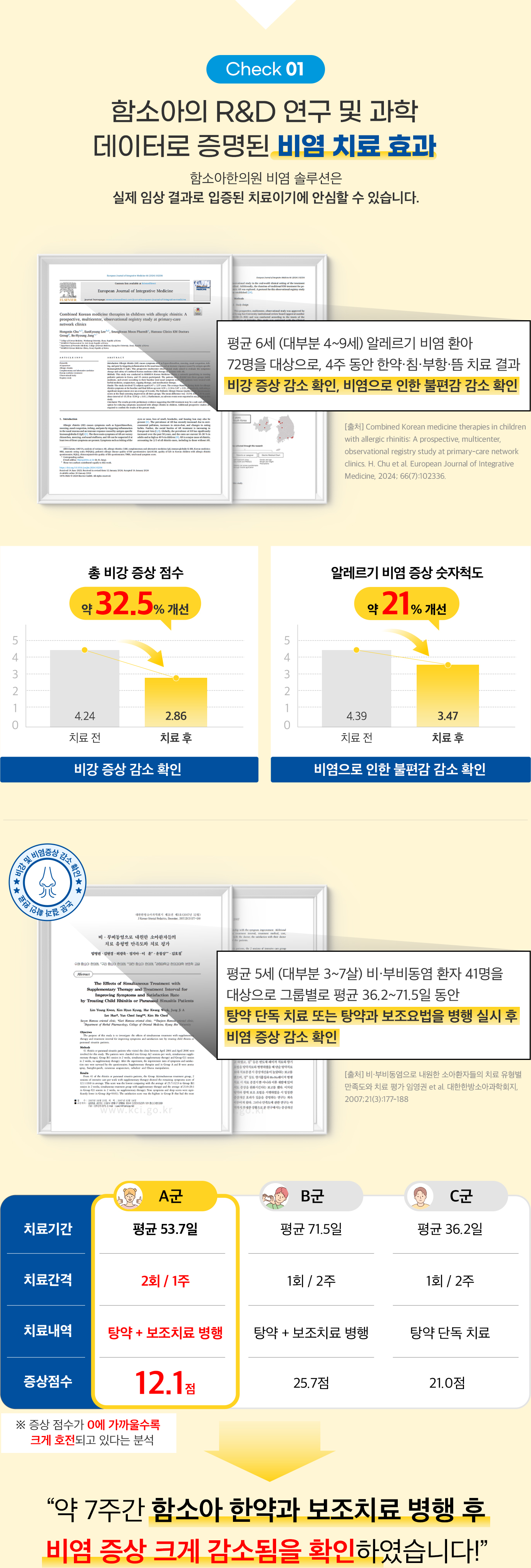 Check 1 함소아의 R&D 연구 및 과학 데이터로 증명된 비염 치료 효과입니다.