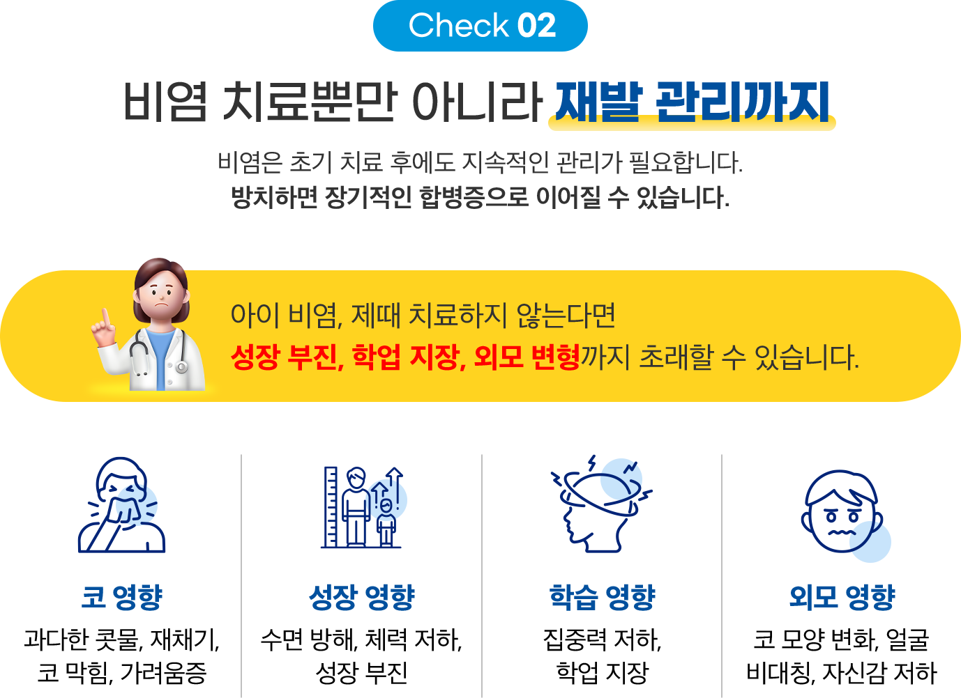 아이 비염, 제때 치료하지 않으면 성장 부진, 학업 지장, 외모 변형까지 초래할 수 있습니다.